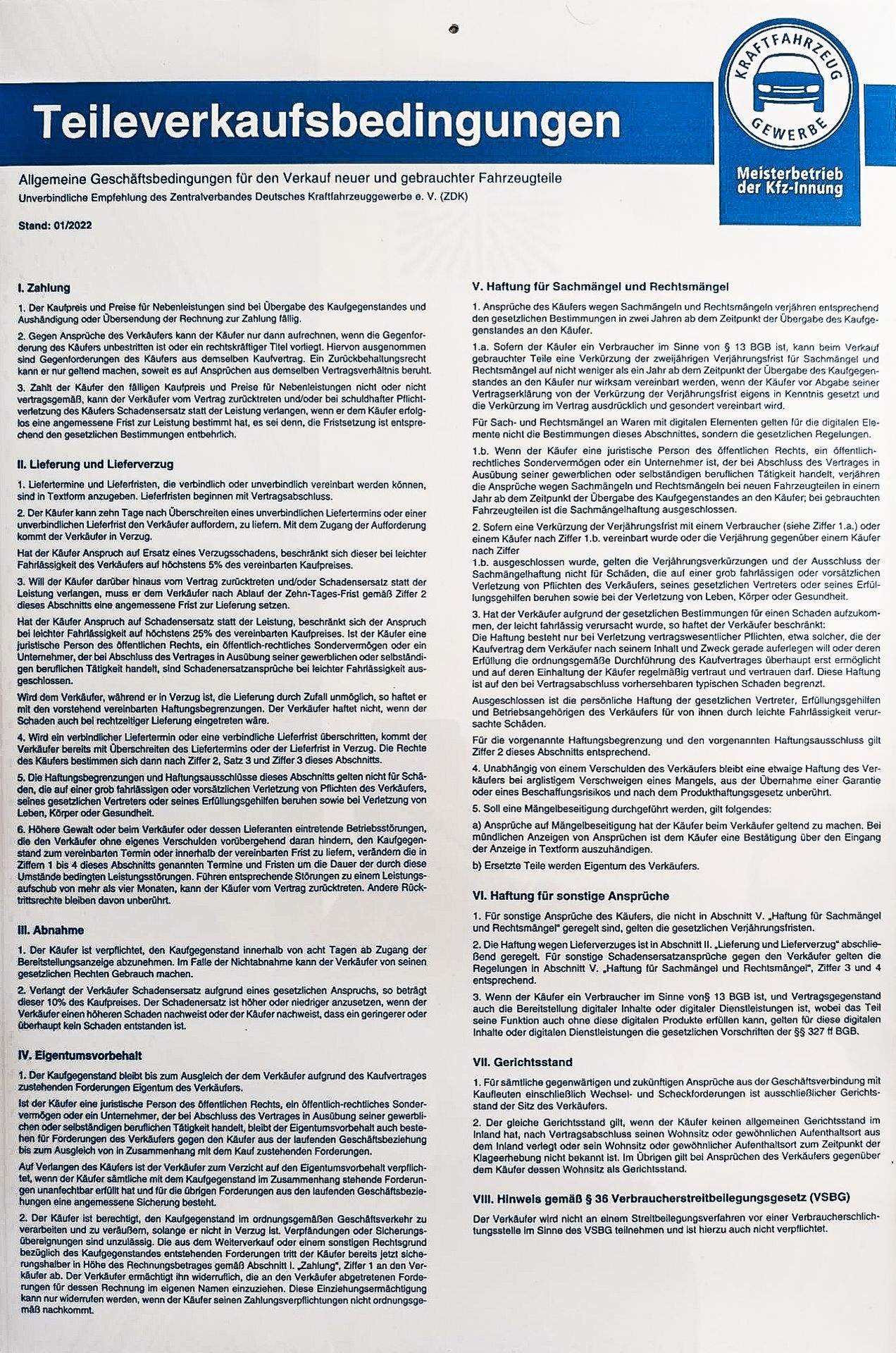 Aushang Teileverkaufsbedingungen/ Kfz Reparaturbedingungen